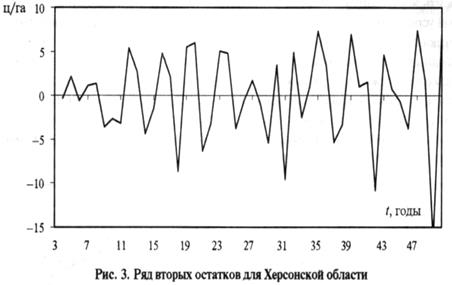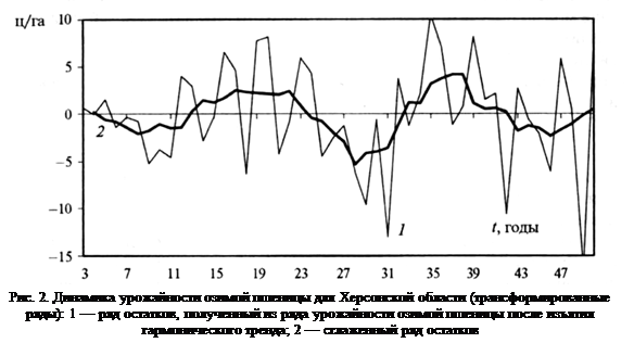Здесь t=1,2... . n - время; а0 , a 1, b 1 - коэффициенты. Ниже показано, что для Херсонской области может быть построен гармонический тренд с периодом Т = 76,0 года (рис.1,2). Ряд остатков, полученный после изъятия тренда (рис.2,1),на первый взгляд, является стационарным, но простой прием позволяет отбросить эту гипотезу. Сгладим ряд остатков методом скользящего среднего с базой усреднения 7 лет (рис.2,2). Становится очевидным, что ряду свойственна цикличность с приблизительным значением периода 16-20 лет. Построим еще один ряд, состоящий из разниц между соответствующими элементами ряда остатков и сглаженного ряда остатков, - ряд вторых остатков. Этот ряд (рис.3) очищен от гармонического тренда и циклической компоненты с периодом 16-20 лет; его вид свидетельствует о том, что кроме среднего цикла такой продолжительности динамика урожайности содержит и короткие циклы со средней продолжительностью около 4 лет.