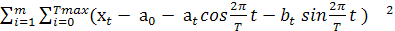 По нашим оценкам, самыми существенными являются первые три гармоники. Значения параметров t-й гармоники (і = 1, 2, 3,... m) последовательно определялись из условия минимума функционала погрешности модели
