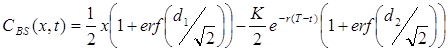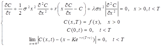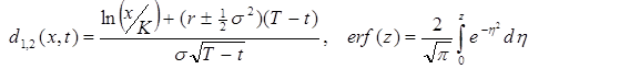 де х − ціна базового активу; t − час, що пройшов з моменту укладення опціонної угоди; C (x ,t ) − функція залежності ціни опціону на купівлю від ціни базового активу x та часу t ; T − час дії опціонної угоди, вимірюється в роках; K − ціна реалізації опціону; r − безризикова ставка, що неперервно нараховується.