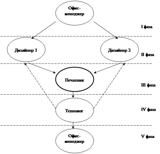 На этой схеме представлена работа ПЦ «Алькор-4». Заявки от клиентов поступают офис - менеджеру, офис – менеджер распределяет заявки между дизайнером 1 и дизайнером 2. Далее дизайнеры передают готовые проекты печатнику. Напечатанный проект отдается на проверку технологу. Если обнаружен какой-либо брак, проект возвращается обратно дизайнеру, либо печатнику (несоблюдение технологии печати), если с проектом все в порядке он передается офис – менеджеру. Затем офис – менеджер отправляет выполненный заказ клиентам.