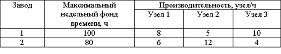 Промышленная фирма производит изделие, представляющее собой сборку из трех различных узлов. Эти узлы изготовляются на двух заводах. Из-за различий в составе технологического оборудования производительность заводов по выпуску каждого из трех видов узлов неодинакова. В приводимой ниже таблице содержатся исходные данные, характеризующие как производительность заводов по выпуску каждого из узлов, так и максимальный суммарный ресурс времени, которым в течение недели располагает каждый из заводов для производства этих узлов.