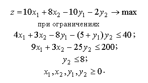 - число часов сверхурочной работы. Целевая функция представляет собой величину суммарного дохода. Первое ограничение связано с невозможностью превысить лимит времени на переработку сырья первого вида, второе - с невозможностью превысить лимит времени на переработку сырья второго вида, третье ограничение и условие неотрицательности переменных самоочевидны.
