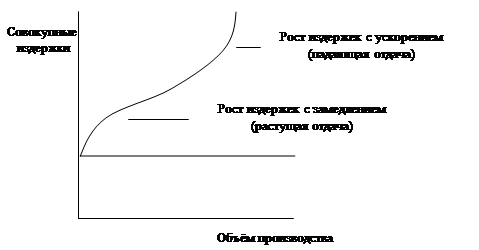 Дальнейшее увеличение объема с помощью доступных ресурсов всегда сопровождается падающей отдачей или ускоренным ростом издержек. Увеличение производства с момента, когда все оборудование более или менее задействовано уже не дает эффекта кооперации, наоборот, дополнительные работники на тех же площадях и мощностях уже в большей степени мешают друг другу, заставляя ожидать одних других. С увеличением напряженности работы на предприятии возникает большая или меньшая расточительность с использованием и других ресурсов, помимо трудовых, больше возникает отходов, потерь. Доводить до максимально возможного объема производство вообще не следует, так как эти последние приращения объема стоят чрезвычайно высоких издержек. На графике совокупных издержек этот ускоренный рост отображается все более крутым уходом вверх кривой, пока она не превратится в вертикальную прямую, показывающую что возможности фиксированных ресурсов уже исчерпаны, дальнейшее наращивание производства за счет тех ресурсов, которые доступны, невозможно.
