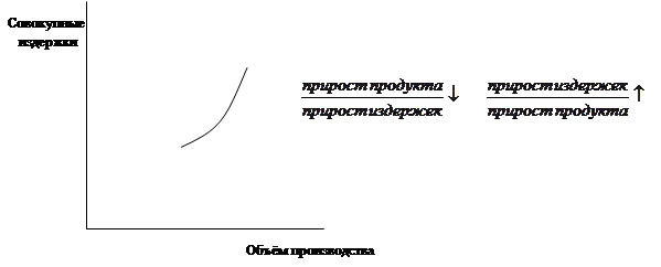 Падение отдачи от последующего вложения доступных ресурсов равносильно росту дополнительных издержек на каждую дополнительную единицу продукции. Падающая отдача и ускоряющийся рост издержек – измерение в обратных величинах одного и того же явления. Начиная с определенного объема производства на предприятии соотношение прирост продукта/прирост издержек снижается, а соотношение прирост издержек/прирост продукта растет.