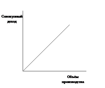Выбор оптимального объема производства – это выбор объема, при котором (при данной цене за единицу товара) предприятие получит максимум прибыли (или минимум убытков, если положительной прибыли получить невозможно). Будем считать прибылью только экономическую прибыль за вычетом внешних и внутренних издержек, хотя максимизация бухгалтерской прибыли даст такие же результаты. График роста доходов предприятия от выпуска продукции представлен прямой линией, которая отражает прямо пропорциональную зависимость дохода от объема. Здесь следует оговориться, что это правильно в отношении предприятий-конкурентов, которые цены на продукцию не выбирают, а принимают ту, которая сложилась на рынке. Предприятия-монополисты могут, меняя объем производства, менять цены.