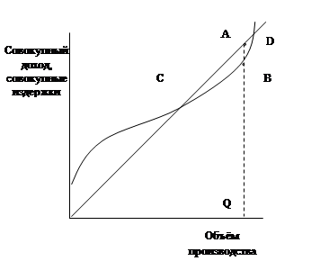 Наложив график совокупного дохода на график совокупных издержек, можно наглядно определить тот объем производства, который при данной цене на продукцию даст максимум прибыли. Он определен той линией, которая покажет максимальное расстояние между доходом и издержками. На графике это расстояние AB при объеме Q.