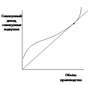 Но может быть так, что цена на товар сложится на уровне издержек (к чему конкурентный рынок постоянно подталкивает). В этом случае предприятие не получит никакого дополнительного «жирка» по отношению к тому, что оно должно возместить в качестве издержек. Это значит, что график дохода проходит под таким углом, который обеспечивает касание с графиком совокупных издержек в одной точке. Это и есть точка оптимального объема, более благоприятных возможностей для получения экономической прибыли рынок не дает.