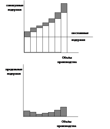График предельных издержек переводит график совокупных из разряда суммарных в разряд приростных величин. Каждый столбик предельных издержек демонстрирует, насколько столбик совокупных издержек стал больше по сравнению с предыдущим, включающим издержки производства всех единиц, за исключением последней.