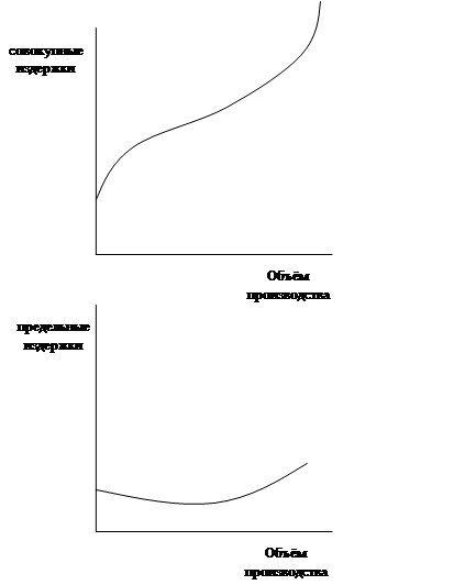 Кривизна совокупных издержек, следовательно, переменных, объясняется одной фундаментальной закономерностью экономики. Если какие-то ресурсы в производстве фиксированы, а другие доступны, то увеличение объема производства за счет доступных ресурсов сопровождается следующим эффектом: сначала (от нуля до определенного объема производства) объем производства растет быстрее издержек, потом наращивание объема производства за счет доступных ресурсов приводит к более быстрому росту издержек, чем объема. На графике это различие (до определенного объема и после) выражено в том, что сначала кривая издержек выгибается в одно сторону, затем после точки перелома в другую. Рассмотрим эту закономерность на примере предприятия, хотя она имеет место в любом хозяйстве, везде и всегда. На предприятии фиксированным ресурсом является основной капитал, который определяет масштабы производства. Другие ресурсы, составляющие переменные издержки, чаще всего вполне доступны, их можно привлекать больше или меньше в зависимости от объемов производства. Как будут расти издержки, если наращивать объем от нуля до предельно возможного на предприятии? Вначале (до точки перелома) издержки растут вместе с объемом, но замедляющимся темпом, то есть на каждый дополнительный объем требуется все меньше дополнительных издержек. Соотношение прирост объема/прирост издержек растет с каждой последующей единицей объема, а соотношение прирост издержек/прирост объема снижается.