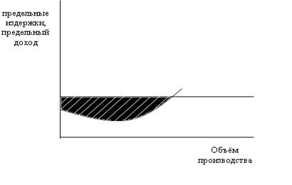 Таким образом, заштрихованная площадь – прибыль без вычета постоянных издержек. На решение вопроса о том, сколько следует производить, постоянные издержки нисколько не влияют, поскольку они неизменны и вычитаются при любом объеме производства – оптимальном или нет. Может случиться так, что суммы дополнительной прибыли окажется недостаточно, чтобы при вычете постоянных издержек получалась положительная величина или ноль. Это значит, что предприятие вообще не может получить экономической прибыли, но и в данном случае объем, при котором исчерпывается положительная разность предельного дохода и предельных издержек будет наилучшим, поскольку при этом объеме убытки будут минимальными.