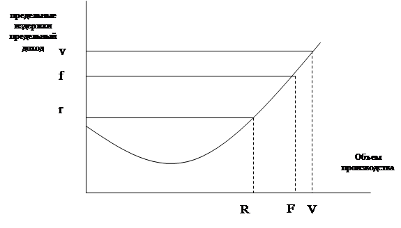 График цены для отдельного предприятия – горизонтальная прямая, поскольку оно цены не выбирает, а вынуждено признавать ту, которая сложилась на рынке. Поскольку цена единицы продукции и есть предельный доход от ее продажи, оптимальный объем определяет та точка, в которой пересекается горизонтальная линия цены и кривая предельных издержек. При цене v объем, который обеспечит максимальную прибыль, равен V, при цене f оптимальный объем равен F.Самые низшие точки этого графика принимать во внимание не следует, так как при таких ценах производство настолько убыточно, что невозможно окупить даже текущие издержки – зарплату и сырье. Но есть минимально приемлемая цена, например r, при которой продолжать производство в объеме R выгоднее, чем останавливать – из-за выходных пособий работникам и некоторых других издержек прекращения производства. Конечно, производство при низких ценах возможно на коротком временном периоде, в течение которого ведутся поиски выхода из убыточной ситуации.