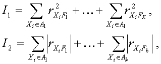Формально задача об одновременной группировке параметров и выделении существенных факторов заключается в максимизации как по разбиению параметров на множества {A1 ,…,Ak } так и по выбору факторов {F1 ,…,Fk } одного из двух критериев.
