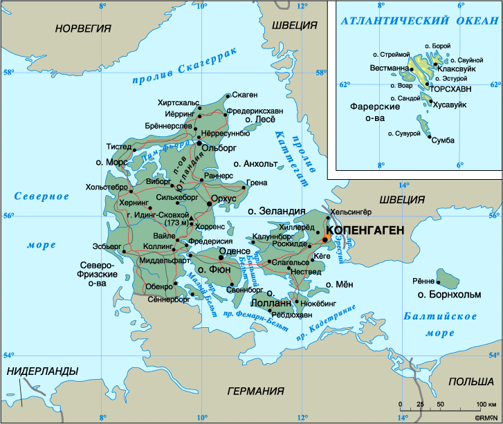 | Дания . Столица – Копенгаген. Население – 5 220 тыс. человек (1997). Плотность – 122 человека на 1 кв. км. Городское население – 85%, сельское – 15%. Площадь – 43 093 кв. км. Самая высокая точка – гора Идинг-Сковхой (173 м), самая низкая – 12 м ниже у.м. Государственный язык – датский. Основная религия – лютеранство. Административно-территориальное деление: 14 амтов и 2 самостоятельные городские коммуны (Копенгаген и Фредериксберг). Денежная единица: крона = 100 эре. Национальные праздники: День Конституции – 5 июня, День рождения королевы – 16 апреля. Государственный гимн: «Это прекрасная страна». |