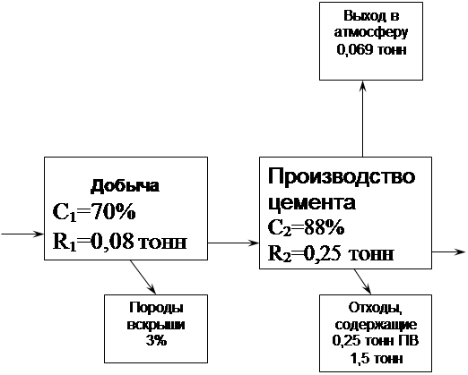 Коэффициент вскрыши равен 1,5 (на одну часть сырья приходится 1,5 пород вскрыши. Всего 2,5 части.) Содержание полезного вещества на первом звене технологической цепочке – 70%, на втором – 88%. Выброс вещества в атмосферу составит на выходе обоих звеньев 3%.