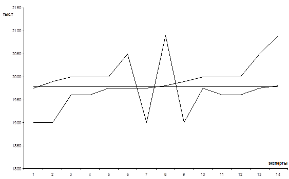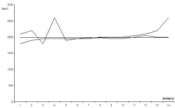 Результатом экспертизы является медиана ранжированного ряда в туре 2: Me=1978 (тыс.т.)