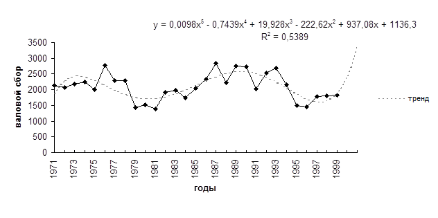 В качестве прогнозной функции выбираем полином 5-й степени, уравнение которого приведено на рисунке 4. Величина R2 = 0,5389 приемлема. Прогнозное значение валового сбора для 2000 года равно 2500 тыс.тонн, что превышает результаты экспертной оценки.