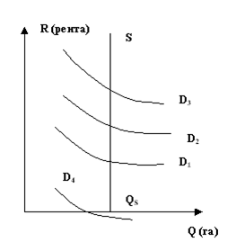 Рассмотрим ренту, получаемую владельцами земли. В целях упрощения мы будем считать, что вся имеющаяся в стране пахотная земля обладает одинаковой урожайностью и используется для производства зерна. Рынок земли - рынок совершенной конкуренции, т.е. имеется значительное количество и владельцев земли, и зерноводческих хозяйств. Поскольку суммарное количество земли фиксировано, то ее суммарное предложение абсолютно неэластично, и кривая предложения земли вертикальна (рис.1). Кривые же суммарного спроса (D 1 , D 2 , D 3 ) имеют обычное очертание: для земли, как и любого другого ресурса, «падающий» характер кривой спроса объясняется действием закона уменьшающейся отдачи, а также тем фактом, что для зерноводческих хозяйств, как единой группы, необходимо понизить цену зерна, чтобы продать дополнительное его количество.