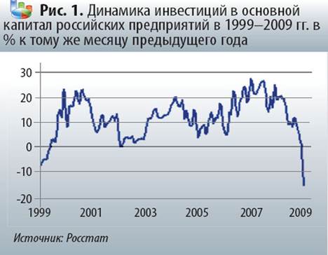 По данным Росстата, в I полугодии 2008 г. прирост инвестиций в основной капитал превышал 15 % от уровня того же периода предыдущего года, а в октябре — ноябре он замедлился до 4–7 %. В декабре 2008 г. наметился спад капитальных инвестиций, который в январе нынешнего года достиг рекордно низкого значения за последние 10 лет: –15,5% (см. рис. 1).