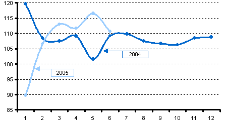 Из рис. 4 видно, что в I квартале т.г. динамика реальных располагаемых денежных доходов характеризовалась противоположным движением относительно ситуации в I квартале 2004 г. Однако, можно заметить, что резкие взлеты и падения имеют причиной значительные отклонения в базовом периоде (месяце) на протяжении всего рассматриваемого периода 2005 г.