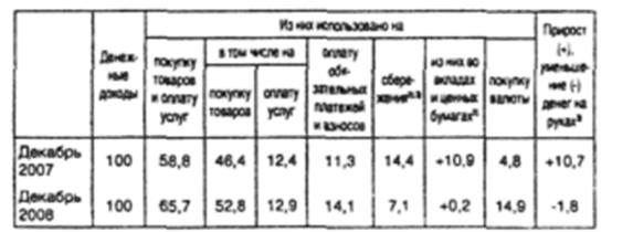Изменения в структуре денежных доходов населения за год – декабрь 2008 г. относительно декабря 2007 г. – можно оценить как заметные, что стало следствием проявления финансового кризиса в стране. Доля средств, направляемая на покупку товаров и оплату услуг увеличилась на 6,9 процентных пункта. Это произошло за счет роста на 6,9 процентных пункта доли средств, направляемых на покупку товаров. Доля сбережений упала более, чем в два раза – до 7,1 процентных пункта. Еще более существенно сократилась доля сбережений во вкладах и ценных бумагах – с 10,9 до 0,2%. Доля средств населения, направляемых на покупку валюты, упала на 10,1 процентный пункт. Существенные изменения произошли с показателем прироста денег на руках у населения, сократившегося с 10,7% до (-1,8%).
