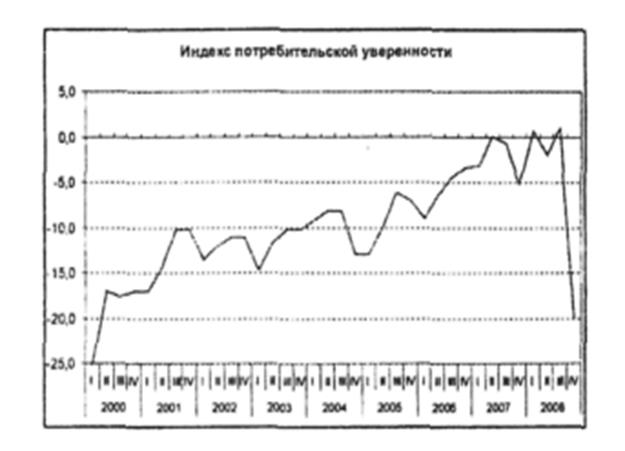 Результаты обследований, проведенных Росстатом в IV квартале 2008 г., свидетельствуют о резком снижении уровня потребительской уверенности населения России. Индекс потребительской уверенности, отражающий совокупные потребительские ожидания населения, упал в IV квартале 2008 г. до (-20%). По сравнению с III кварталом 2008 г. он снизился на 21 процентный пункт. Наблюдаемый уровень индекса примерно соответствует показателям IV квартала 2000 г. (-17%).