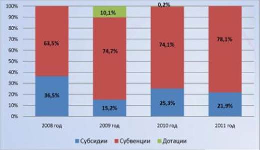 На 2010 год общий объем межбюджетных трансфертов субъектам Российской Федерации может составить около 1,1 трлн. рублей. Дотации в целом составят 0,5 трлн. руб., основной объем которых приходится на дотации на выравнивание бюджетной о6ecneчениости. Будут также предусмотрены на 2010 год дотации на поддержку мер по обеспечению сбалансированности для оказания финансовой помощи субъектам Российской Федерации, которые будут испытывать трудности с исполнением расходных обязательств. Субсидии сократятся в целом на треть.