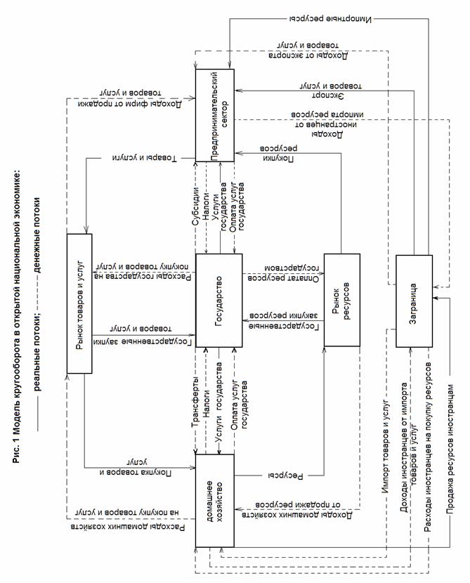 Функционирование национальной экономики в упрощенном виде может быть представлено в модели кругооборота реальных и денежных потоков, где реальные потоки представляют собой движение товаров и услуг, а денежные – движение доходов и расходов хозяйственных субъектов (рис. 1).