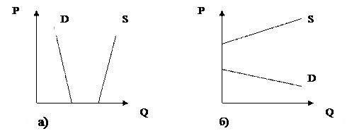 Рис.2.2. Объем предложения превышает объем спроса при любой неотрицательной цене а); цена предложения превышает цену спроса при любом неотрицательном объеме б).[3]