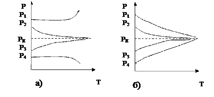 Устойчивое равновесие достигается тогда, когда отклонение цен спроса от цен предложения постепенно погашается, стремясь к равновесной цене PE , а объем предложения приспосабливается к объему спроса. В точке равновесия цена спроса совпадает с ценой предложения (PD = PS ) и объем спроса равен объему предложения (QD = QS ). Равновесие может быть устойчивым и неустойчивым, локальным и глобальным. Устойчивое равновесие, в свою очередь, бывает абсолютным и относительным. Отложим на оси абсцисс время T, а на оси ординат цену P. Когда отклонения от равновесной цены (например, P1 ,P2 ) постепенно выравниваются на уровне PE , на рынке складывается устойчивое равновесие. Абсолютное равновесие имеет место в случае установления единой равновесной цены рис.2.4 а), относительное – при небольших отклонениях от нее рис.2.4 б).