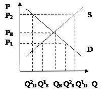 Если реальная рыночная цена (Р1 ) выше Ре , то объем спроса (QD ) будет меньше объема предложения (QS ), т.е. возникает избыток товара (DQS ). Избыток предложения всегда действует в сторону понижения цены, т.к. продавцы будут стремиться избежать затоваривания.