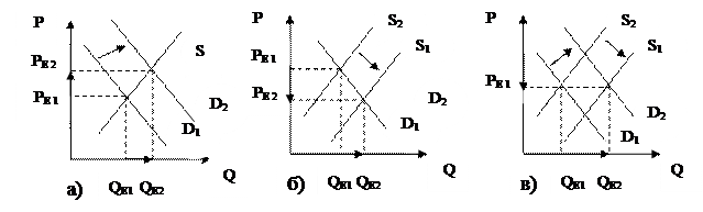 рночное равновесие а) при росте спроса; б) при росте предложения; в) при одновременном и однонаправленном изменении спроса и предложения.[9]