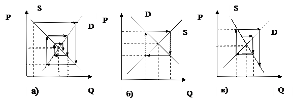 Рис.2.9. Устойчивое (а) и неустойчивое (в) равновесие в паутинообразной модели и регулярные колебания (б) вокруг него.[11]