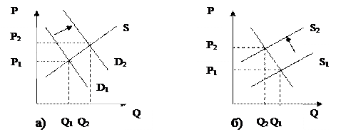 Такой сдвиг показан на рис. 2.10, где линии спроса и предложения имеют нормальный (соответственно отрицательный и положительный наклон) на рис. 2.10 а), сдвиг линии спроса приводит к росту равновесной цены с P1 до P2 при одновременном увеличении равновесных объемов с Q1 до Q2 . На рис. 2.10 б) сдвиг линии предложения влево ведет к повышению равновесной цены при одновременном сокращении равновесного объема.