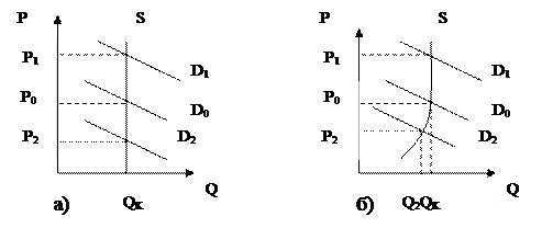 В мгновенном периоде продавец вообще лишен возможности приспособить объем предложения к объему спроса, поскольку количество производственных ресурсов и интенсивность их использования заданы. Однако тот факт, что продавец обладает фиксированным количеством товара, не означает, что все это количество должно быть обязательно продано независимо от уровня цены. Многое зависит от природы данного товара. Если товар скоропортящийся и не подлежит хранению, линия предложения будет строго вертикальна. Как видно из рис.2.11 а), в этом случае равновесная цена определяется исключительно спросом, точнее, совпадает с ценой спроса, тогда как объем продаж однозначно задан объемом предложения и не зависит от функции спроса.