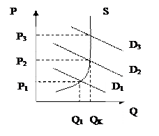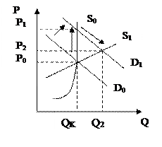 Допустим, что спрос внезапно вырос и представлен теперь кривой D1 , лежащей правее кривой D0 . поскольку резерв мощности отсутствует, новое равновесие достигается исключительно за счет повышения цены до P1 при сохранении прежнего объема продаж QK . В длительном периоде масштаб производства увеличивается за счет ввода новых мощностей и кривая предложения смещается в положение S1 . новое равновесие достигается при цене P2 , более высокой, чем P0 , но ниже, чем P1 , и объеме производства Q2 , большем, чем QK .