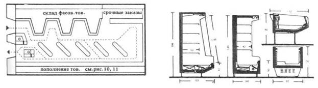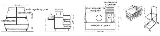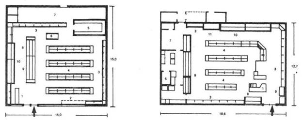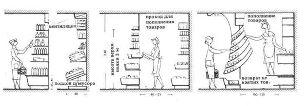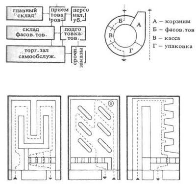 Большое внимание следует уделять графику движения покупателей с корзинами или тележками мимо стеллажей; ширина проходов должна составлять 1,3 —1,6 м; у выхода должны располагаться кассы и места для упаковки товаров.
