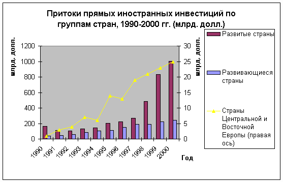 В период с 1990 года по 2000 год инвестиционная деятельность в мире велась в основном с развитыми странами. (Рост инвестиций с 50 млрд.долл. до 1000 млрд. долл.). Инвестирование в развивающие страны практически изменилось примерно в 4-5 раз. Стоит отдельно отметить страны Центральной и Восточной Европы, где инвестирование в их экономики выросло с практически нулевой отметки до 25 млрд.долл. Этот факт свидетельствует о том, что развитие этих стран ускорялось, начиная с 1991 года.