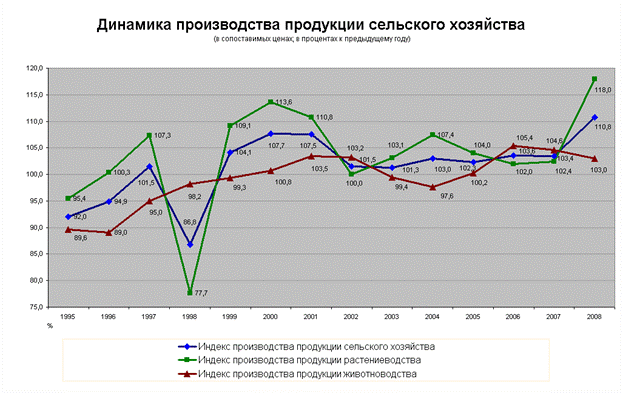 Стабильное развитие животноводства и скачкообразное растениеводства связано не только с климатическими изменениями, но и с изменением экономики страны в целом. В 1998 году в целом сельское хозяйство прибывало в упадке. В дальнейшем же рост показателей сельского хозяйства стабилен, и не превышает 10%. Но при этом животноводство и растениеводство развиваются по-разному.