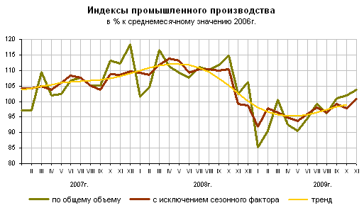 После небольшого роста промышленности до отметки 12% начался спад. Он достиг своей низшей точки (- 7% по сравнению с среднемесячным значением 2006 годя) в начале 2009 года. После чего наблюдается рост и середине октября 2009 года производство вернулось на среднемесячные показатели 2006 года.