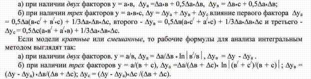 Существует общее правило цепных подстановок, когда обобщающий показатель измеряется путём умножения значений двух факторов (y=a* b), один из которых является количественным (пусть а), а другой – качественным (b). В этом случае при изменении влияния количественного фактора его приращение Δa=(a’-a) умножается на абсолютную величину базового качественного фактора (b), а при измерении влияния качественного фактора его приращение Δb=(b’- b) умножается на фактическое значение количественного фактора (a’), т.е. при Δy=y’- y имеем: Δyb =(a’- a)* b, а Δyb =(b’-b)* a’.
