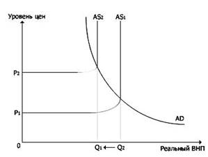 Инфляция издержек может быть изображена графически (рис.1). Смещение кривой совокупного предложения влево (АS1->АS2) в результате действия указанных причин отражает увеличение издержек на единицу продукции, при возрастании цен (Р1->Р2) сокращается реальный объем производства (Q2 < Q1), или реальный ВНП.
