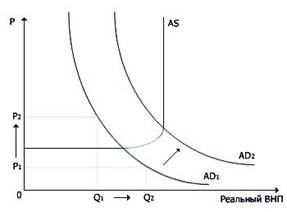Инфляция спроса вызывается увеличением спроса. При этом скорость роста спроса превышает скорость роста предложения. В общем плане инфляция спроса обозначает нарушение равновесия между совокупным спросом и совокупном предложением. Сдвиг кривой совокупного спроса вправо от AD1 к AD2 ведет к росту цен, если экономика находится на промежуточном или классическом отрезках кривой совокупного предложения. Графически инфляция спроса продемонстрирована на рис.2.