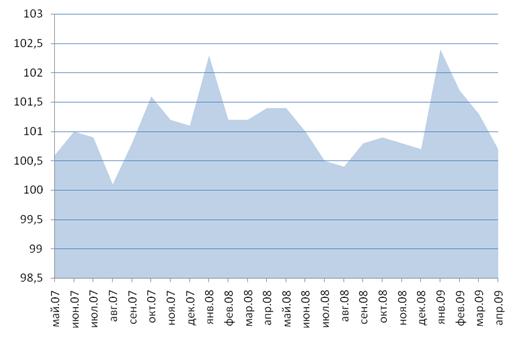 За первый квартал 2009 года в целом по стране цены на первичном рынке жилья снизились на 2,2%, на вторичном – 3,8%. Увеличение размеров процентных ставок и снижение объемов ипотечного кредитования снизили спрос на жилье. Кроме того, за последние полтора – два года данный рынок был необоснованно взвинчен, таким образом в настоящий момент происходит корректировка.