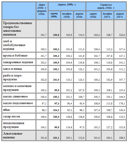 Таблица 1 – Индексы потребительских цен на отдельные виды продовольственных товаров, % [28]