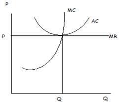 В условиях совершенной конкуренции в долгосрочном периоде соблюдается равенство MR=MC=AC=P (рис. 3). Конечно, в течение короткого отрезка времени в условиях совершенной конкуренции фирма может получать сверхприбыли или нести убытки. Однако для длительного периода такая предпосылка нереальна, так как в условиях свободного входа и выхода из отрасли слишком высокая прибыль привлекает в данную отрасль другие фирмы, а убыточные фирмы разоряются и уходят из отрасли.[2]