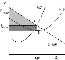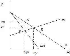 На конкурентном рынке равновесие может быть достигнуто в точке Е, где Рс =МС. В условиях монополистического рынка мы перемещаемся к монопольной цене Рm и количеству продукции Qm . Поскольку монопольная цена превышает предельные издержки (Рm >MC), то величина излишка потребителей и излишка производителей меняются. Площадь треугольника АВЕ соответствует величине чистых убытков от монопольной власти, или так называемой величине мертвого груза монополии.[3]