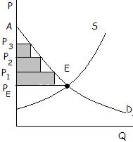 Допустим, что всех посетителей музея делят на две большие группы – российских граждан и иностранцев; российские граждане делятся еще на три группы – дети, студенты и взрослые. Таким образом, выделяется четыре категории потребителей – дети, студенты, взрослые, иностранцы. Для каждой категории назначается своя особая цена. Допустим (рис.8), дети платят Ре , студенты – Р1 , взрослые – Р2 , а иностранцы – Р3 . Таким образом, фирма, используя ценовую дискриминацию, присваивает значительную часть потребительского излишка (заштрихованные сектора), устанавливая цены выше равновесного уровня Ре. В предельном случае дискриминирующая фирма стремится полностью «проглотить» потребительский излишек. При этом заштрихованный сектор стремится заполнить все пространство фигуры Ре АЕ. Этот крайний случай представлен в модели совершенной ценовой дискриминации (рис. 9).