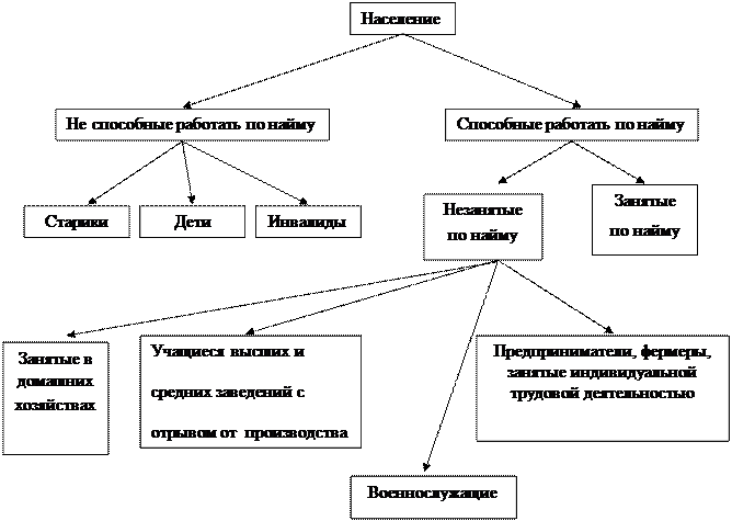 Рынок труда имеет сложное строение. Прежде всего, из общей численности населения нужно выделить ту часть, которая способна работать по найму. Но способность работать по найму не совпадает с понятием «трудоспособное население», к которому статистика относит лиц определенного возраста (в России, например, это мужчины в возрасте от 16 до 60 лет и женщины – от 16 до 55). Тем не менее, в общей численности населения можно выделить две крупные группы: люди способные и неспособные работать по найму, которые в свою очередь подразделяются на определенные подгруппы (таблица 1, приложение 1). Схема, приведенная в приложении, отражает составные части рынка труда: они обособлены друг от друга, самостоятельны и каждая из них выполняет особую функцию, образуя единый рынок труда, который не может существовать без какой-либо части.