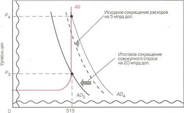Но кривая совокупного спроса смещается вправо, до AD1 , то есть спрос увеличивается больше чем на 5 млрд. руб. дополнительных государственных расходов. Это происходит потому, что эффект мультипликатора приумножает первоначальное изменение спроса с каждым следующим циклом новых потребительских расходов. Если ПСП в экономике составляет 0,75, то простой мультипликатор равен 4. Кривая совокупного спроса сдвигается вправо на расстояние, в 4 раза превышающее длину отрезка, который представляет увеличение государственных расходов на 5 млрд. руб. Данное увеличение совокупного спроса происходит в пределах горизонтального отрезка кривой совокупного предложения, поэтому мультипликатор действует в полную силу и реальный объем производства возрастает в 4 раза. Заметьте, что реальный объем производства подскочил до 505 млрд. руб., то есть возрос на 20 млрд. руб. по сравнению с уровнем 485 млрд. руб., наблюдавшимся во время спада. Одновременно сокращается безработица, так как фирмы вновь нанимают работников, уволенных в период спада.