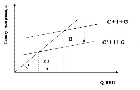 Таким образом налоговый мультипликатор оказывает гораздо меньшее воздействие на уменьшение совокупного спроса, чем мультипликатор государственных расходов на его увеличение. Рост налогов ведет к сокращению ВНП, а снижение налогов—к росту ВНП. Снижение налогов для потребителей ведет к росту их доходов и соответственно к росту их расходов, что выражается в росте спроса на потребительские товары. Снижение налогов для фирм ведет к росту доходов предпринимателей, что стимулирует их расходы на новые инвестиции и ведет к росту спроса на инвестиционные товары.